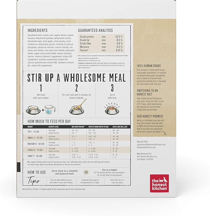 - RANCH RAISED BEEF & ORGANIC WHOLE GRAINS: The Honest Kitchen Whole Grain Beef dog food is made with real whole food ingredients like ranch raised beef, organic oats & apples, which are gently dehydrated for maximum nutrient retention & digestion.