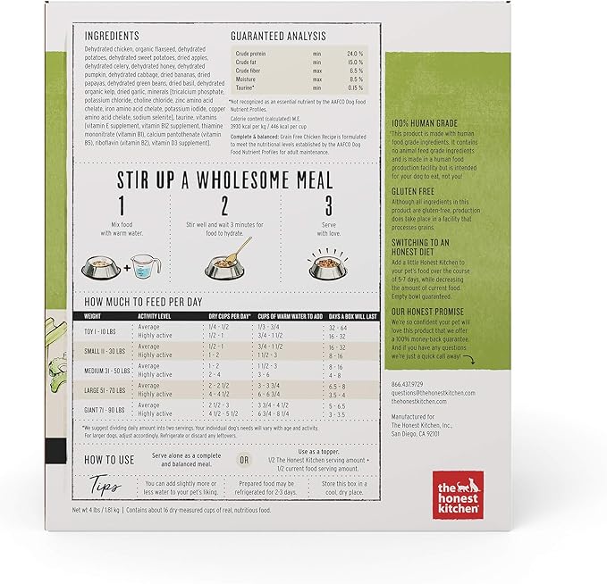 - GRAIN FREE, CAGE FREE CHICKEN: The Honest Kitchen Grain Free Chicken dog food is made with real whole food ingredients like cage free chicken, green beans & apples, which are gently dehydrated for maximum flavor & nutrient retention and easy digestion.