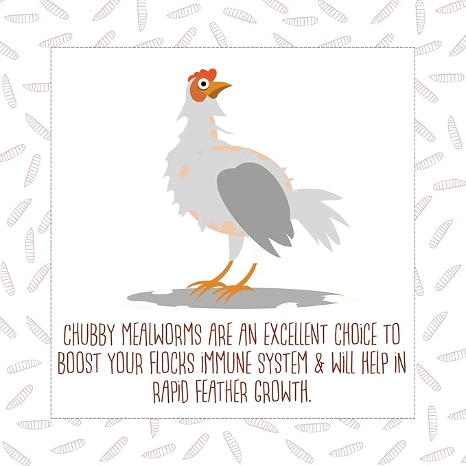 - PROTEIN PACKED ✔️ Chubby Dried Mealworms are packed with a whopping 53% protein and 28% essential fats that are vital to help a chickens immune system during molting season and will help in rapid feather growth.