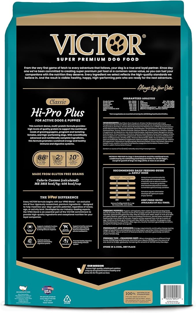- HIGH PROTEIN DOG FOOD: Packed with premium-quality beef, chicken, pork and fish meals; With 30% protein and 20% fat, it provides young dogs and mothers with key nutrients for healthy growth and vitality, making VICTOR Hi-Pro Plus a reliable choice
