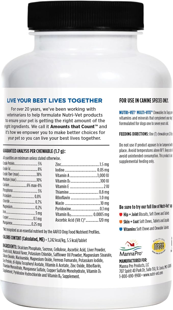 Nutri-Vet Multi-Vite Chewables for Adult Dogs, Daily Multivitamin & Mineral Supplement for Overall Health, Immune Support, and Balanced Nutrition, 180 Count