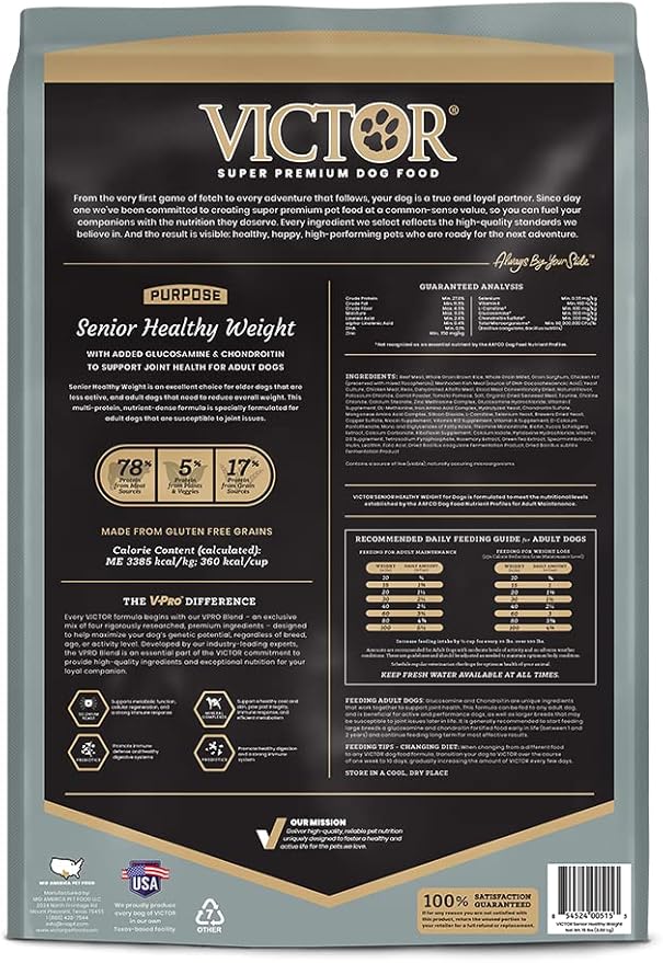 VICTOR Super Premium Dog Food – Purpose – Senior Healthy Weight Management – Dry Dog Food for Adult Dogs – Gluten Free with Glucosamine and Chondroitin, for Hip and Joint Health, 15lbs