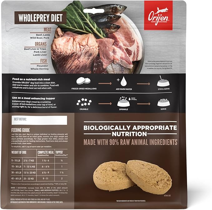 - ORIJEN freeze dried dog food is a concentrated source of animal protein that can be served as a meal or used as a dog food topper