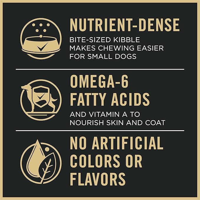 - Small dog food kibble provides 100 percent complete and balanced adult dog food for dogs under 20 pounds and contains no artificial colors or flavors