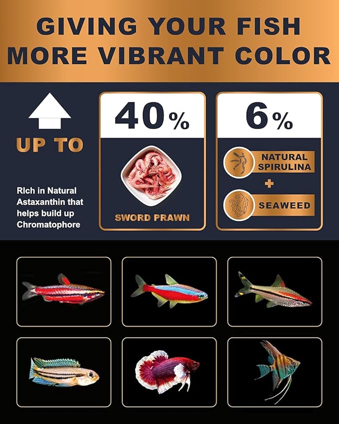 - High Palatability : Our food contains up to 40% of wild sword prawns, fresh squid, natural spirulina, fresh garlic, plus a mixture of premium selected natural ingredients along with the perfect pellet size. This formula is an ideal staple food for small and medium size tropical fish, such as angelfish, neon tetras, cardinal tetras, congo tetras, glowfish,etc