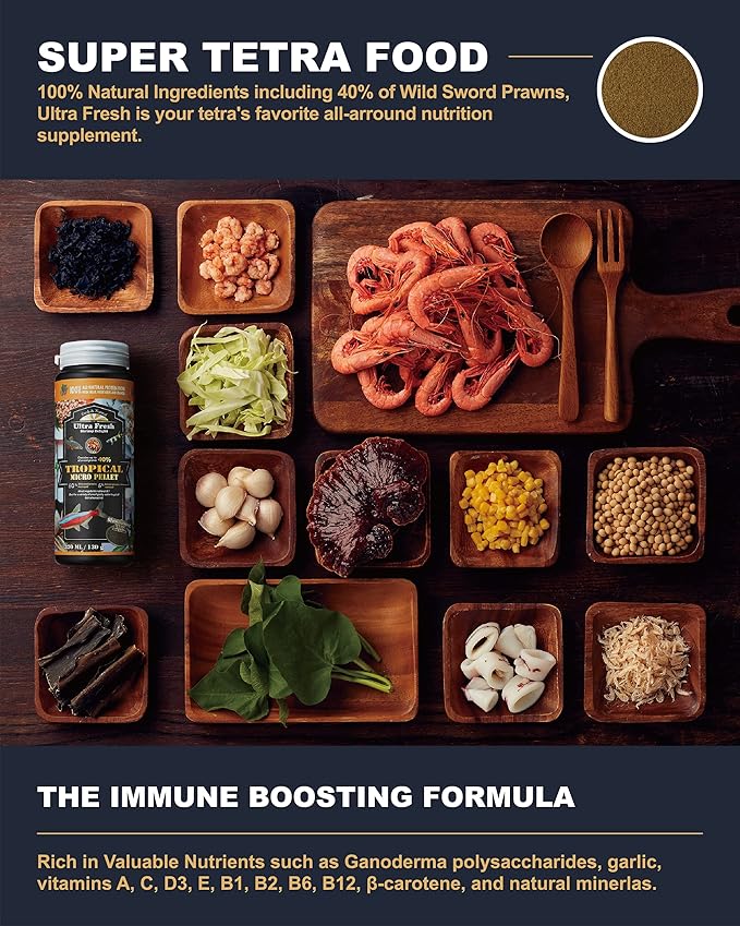 Ultra Fresh Tetra Fish Food, Slow Sinking, All Natural Ingredients, Wild Sword Prawns, Spirulina, Natural Color Enhancement, Small Granules for Small Fish, Tropical Micro Pellet 4.6 oz