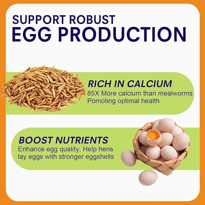 - 【Healthier Feather & Strong-Shelled Eggs】MEILLEURE BSFL are natural supplement that help chicken receive sufficient amino acids(Lysine & Methionine) during molt. The high levels of protein and amino acids of BSFL ensure chicken’s healthy feather regrowth. Also, the BSFL have an optimal phosphorus to calcium ratio that enable superior eggshell strength during nesting seasons, so it's not easy to find broken eggs in your coop.