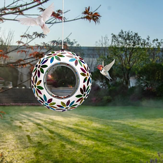 VCUTEKA Bird Feeder for Outside Hanging with Round Shape Glass Container to Attract More Wild Birds, Mosaic Fly Through for Garden, Yard, Backyard, Deck and Porch Decor, 7-Inch