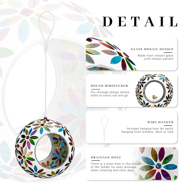 - 【Mosaic Design】This round mosaic bird feeder with a hanging wire so you can easily hang the feeder outside to brighten up your backyard, patio, lawn, deck, or balcony. It catches sunlight as it gently spins and sparkles. Size: 7 x 7 x 3.5 inches