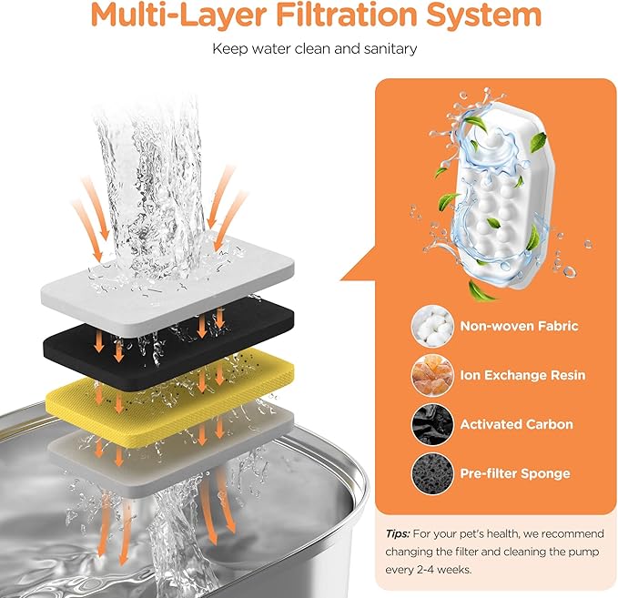 - š¾ćQuadruple Filtration SystemćCat fountains is equipped with an activated carbon filter, which consists of cotton layer, activated carbon, and ion exchange resin, forming a triple filtration system. It can remove odor and soften water. Meanwhile, the filter sponge captures pet hair, dirt, and food particles, providing your pet with pure and healthy water.