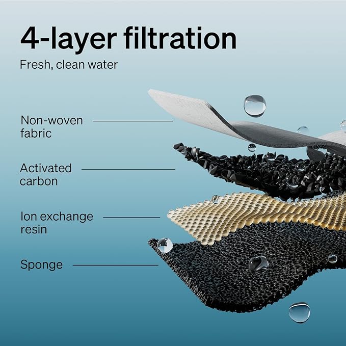 - Vertical Filtration System - 1. Activated carbon eliminates foul odors 2. Ion exchange resin removes heavy metal ions and softens water quality 3. The non-woven fabric captures cats' hair and impurities 4. The built-in pump sponge further filters debris to prevent blockages and damage.