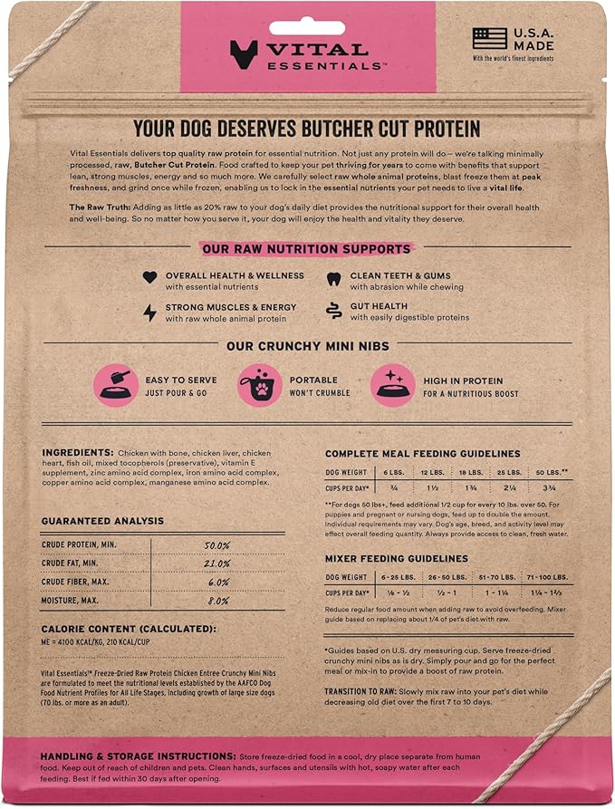 - CRUNCHY FREEZE-DRIED RAW CHICKEN DOG FOOD: Vital Essentials Crunchy Freeze Dried Dog Food packs more protein than industry standard into every bite to deliver the peak vitality your dog deserves, especially when compared to dehydrated dog food. This complete and balanced freeze-dried raw dog food is made with premium butcher cut chicken, responsibly sourced in the USA.
