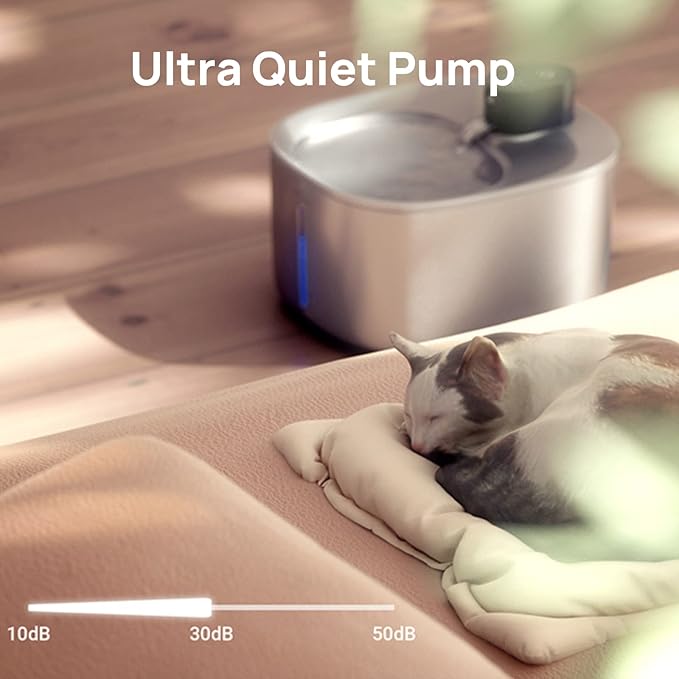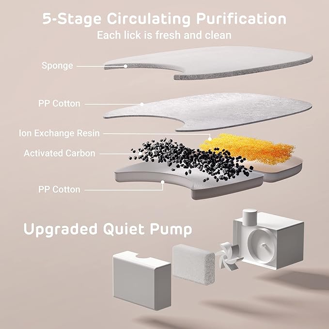 - Whisper-quiet Operation - The water fountain for cats inside features a CE certificated IP68 pump, which runs with 2W low consumption. The only sound you may hear is the water dripping through the strainer into the bowl.