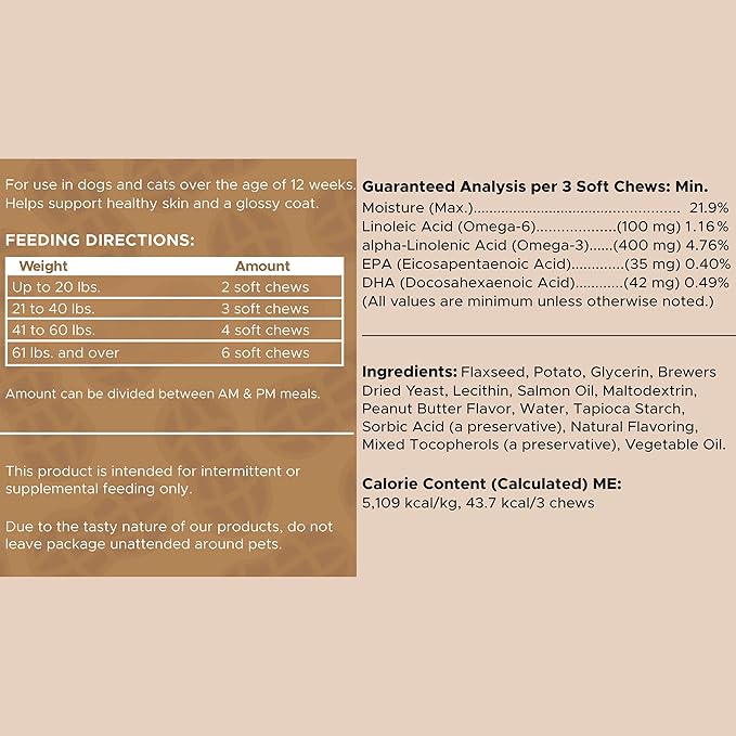 - This dog supplement contains omega fatty acids derived from salmon oil, fish oil, flaxseed, and more to promote and support healthy skin and fur.