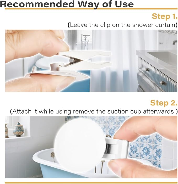 - Simple press the suction cup onto shower room wall and clip the curtain side.
