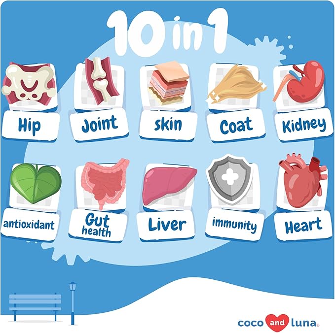 - Liver Support - Coco and Luna 10 in 1 is a dog vitamin that contains Potassium, Vitamin B Complex, and EPA and DHA from Cod Liver Oil, that helps to protect the liver and supports the liver's ability to detoxify the body.