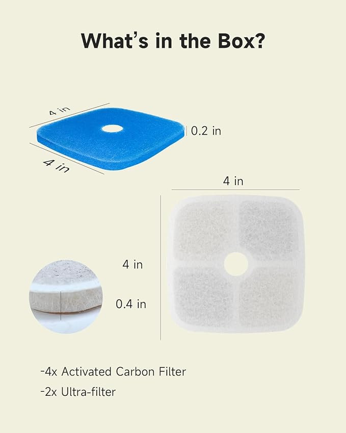- [Longer Service for Healthy Water] Thanks to the upgrade one cat fountain filters with 4 pre-filter sponge, service life can be as long as 14 DAYS/ WEEKS. Length: 4 IN. Breadth: 4 IN. Thickness: 0.4 IN.