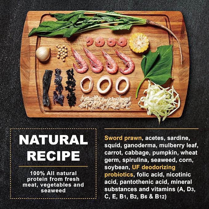 - High Palatability : Sword Prawn Flavor - A blend of wild sword prawns, akiami paste shrimp, vegetables and seaweed. A perfect 6:4 meat/vegetable protein ratio