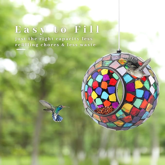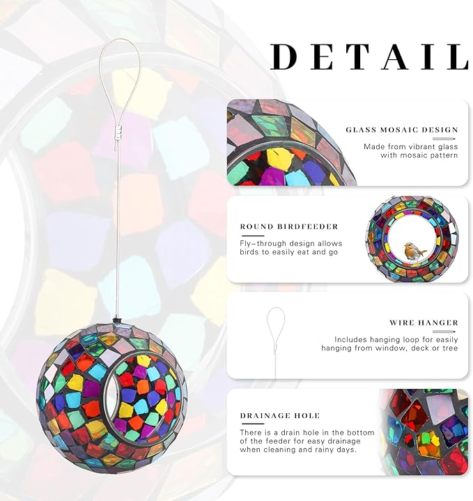 - 【Mosaic Design】This round mosaic bird feeder with a hanging wire so you can easily hang the feeder outside to brighten up your backyard, patio, lawn, deck, or balcony. It catches sunlight as it gently spins and sparkles. Size: 7 x 7 x 3.5 inches