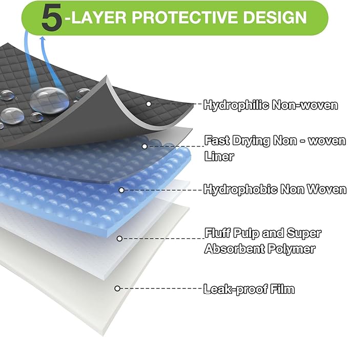 - 5-LAYER LEAK PROOF: Upgraded protection design, absorbent layer, drainage layer, water locking layer, water proof PE membrane multi-layer protection structure, provides ultimate protection for pets, ideal for training puppies and senior dogs
