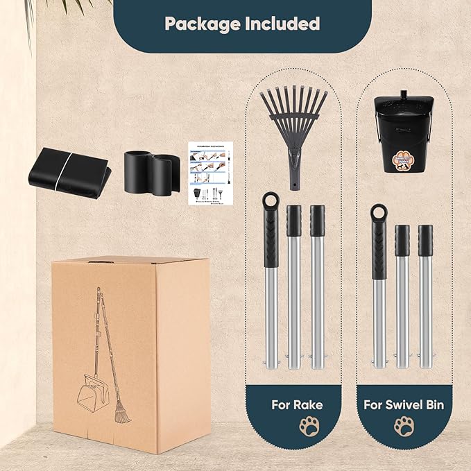 - Versatile & Multi-Surface Use: This dog pooper scooper set includes a rotating bin and rake, making it perfect for use on grass, concrete, gravel, and dirt. It’s ideal for picking up pet waste, leaves, and garden debris, providing quick cleanup whether at home or while out on walks. Suitable for large, medium, and small dog breeds.