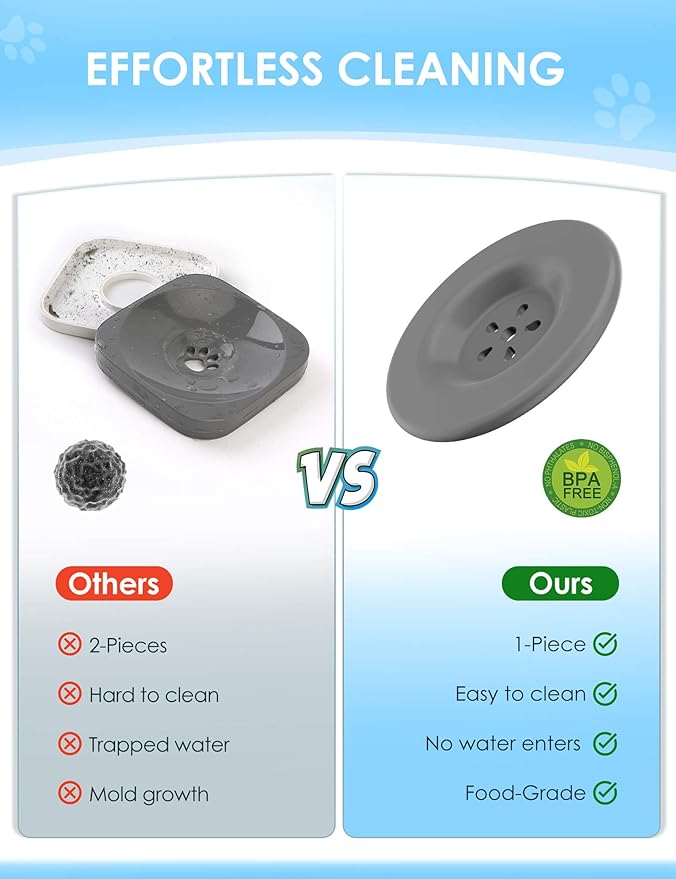 - 【One Piece Molded Floating Disk】Besides lid, the bowl also goes with a floating disk to slow down water drinking, also helps prevent dust, dirt, and pet hair from falling into the water. What’s more, it is an upgraded one piece molded floating disk, no water seepage, never get moldy or dirty, no need to pry open for cleaning.