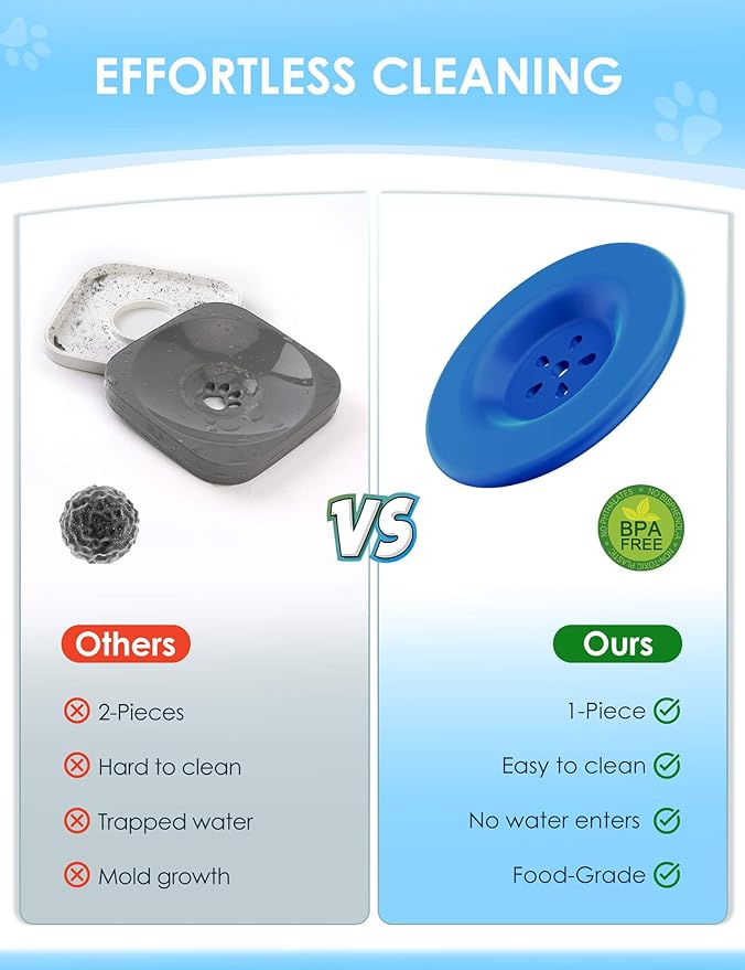 - 【One Piece Molded Floating Disk】Besides lid, the bowl also goes with a floating disk to slow down water drinking, also helps prevent dust, dirt, and pet hair from falling into the water. What’s more, it is an upgraded one piece molded floating disk, no water seepage, never get moldy or dirty, no need to pry open for cleaning.