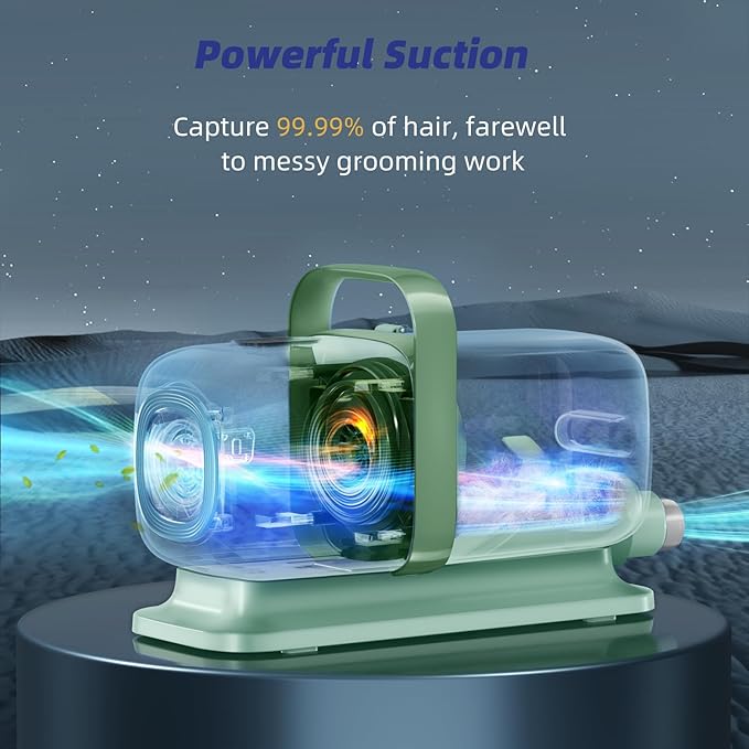 - š¶ćPowerful Vacuum SuctionćThe Buenkee dog grooming kit comes with a powerful vacuum up to 15000pa, which can trap 99.99% of pet hair and dander into the dust cup while grooming. Pet hair won't spread all over the house. And there's no need to clean the workspace afterward.