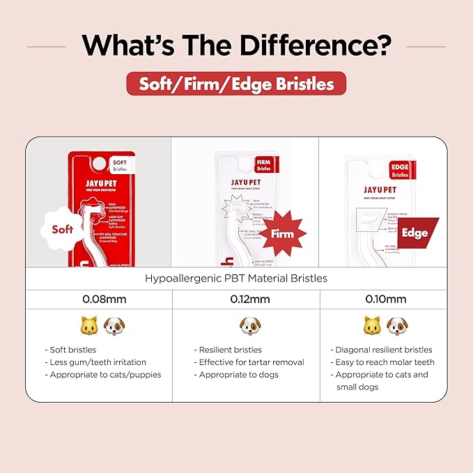 - Resilient Diagonal-shaped Bristles (0.10mm microfiber) -The diagonal cut PBT bristles help to remove the pet tartar in between the molar and teeth.