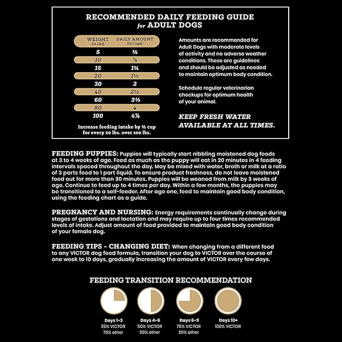 - MADE IN THE USA: We proudly produce every bag of VICTOR kibble in our own Texas-based facility and do not waver in our commitment to high-quality nutrition. A majority of ingredients in our pet food come from ranches, farms and other trusted suppliers who are within a day’s drive of our East Texas plant