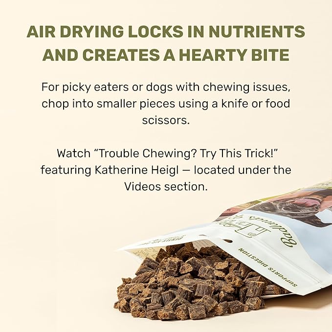 - If your dog has trouble chewing, watch the “Trouble Chewing? Try This Trick!” video featuring Katherine Heigl — it's available under the product listing in the Videos section.