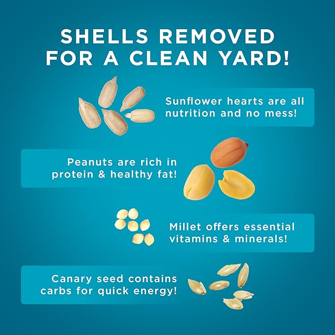 - No Mess Formula – Shell-free blend with sunflower hearts, chips, and peanut pieces helps keep feeding areas clean