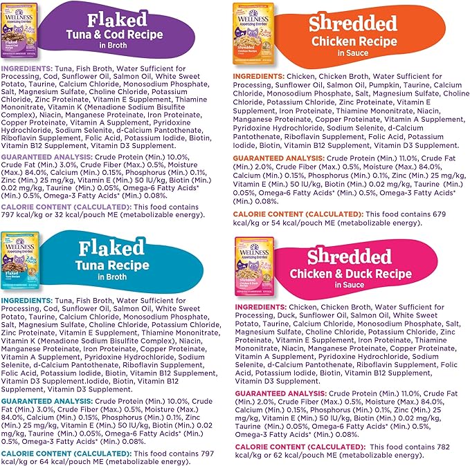 Wellness Appetizing Entrées Flaked & Shredded Adult Wet Cat Food, Natural, Protein-Rich, Grain Free, 2.8 Ounce Pouch, 8 Pack (Seafood & Poultry Variety Pack)