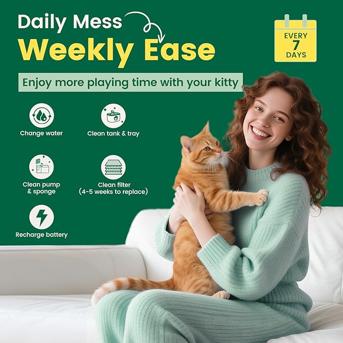- 2-STEP CLEANING, SIMPLIFY YOUR MAINTENANCE ROUTINE: Just lift it off, then put all parts in the tank into water to wash, no longer need to unplug or remove battery. This cat water fountain cordless is easier to clean and refill. It's better to clean the tank, filter and pump weekly (NOTE: The base CANNOT be washed)