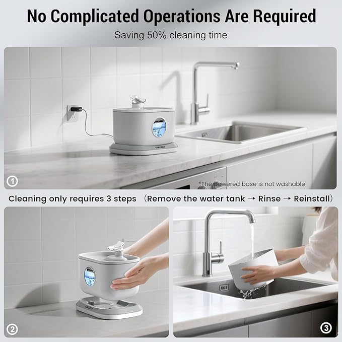 - 2-STEP CLEANING, SIMPLIFY YOUR MAINTENANCE ROUTINE: Just lift it off, then put all parts in the tank into water to wash, no longer need to unplug or remove battery. This cat water fountain cordless is easier to clean and refill. It's better to clean the tank, filter and pump weekly (NOTE: The base CANNOT be washed)