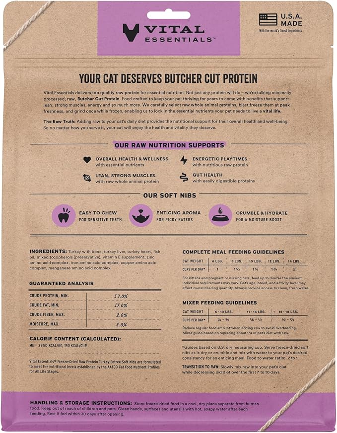 - SOFT NIBS FREEZE-DRIED RAW TURKEY CAT FOOD: Vital Essentials Freeze Dried Cat Food packs more protein than industry standard into every soft bite to deliver the peak vitality your cat deserves, especially when compared to dehydrated cat food. Our complete and balanced freeze-dried raw cat food is made with Butcher Cut premium turkey, responsibly sourced in the USA.