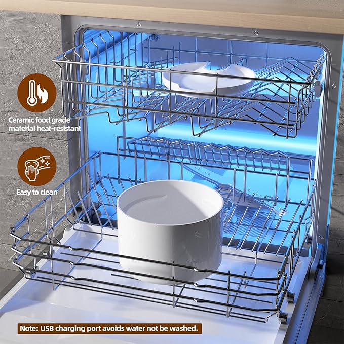 - Ceramic Cat Water Fountain: Automatic water dispenser made from porcelain fired at high-temperatures of 1240 degrees and glazes are food safe material. That is durable and scratch-resistant.The ceramic tray and tank can be used for dishwashers to give your furry friends a health drinking environment.Except for the filter tray which is made of ABS and is BPA free.