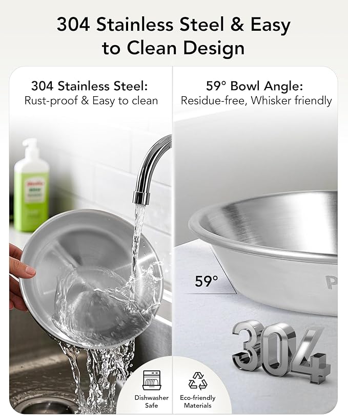 - Durable Stainless Steel Bowls with Stable Stand: Both the bowls and the stand are made of high-quality stainless steel, ensuring durability and long-lasting use. The stand features non-slip silicone feet, preventing the elevated cat food bowls from sliding or tipping over during mealtime. Whether your pet is an enthusiastic eater or prone to knocking things over, the raised cat bowl set provides a stable, mess-free solution that works well for both cats and small dogs.