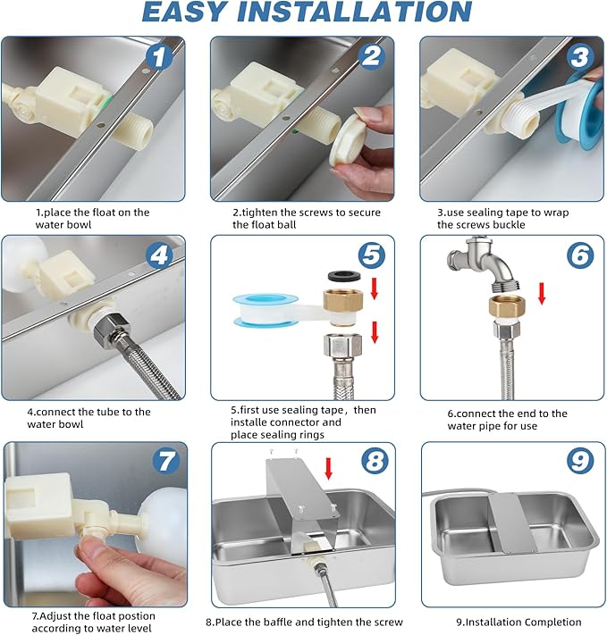 - Automatic pets drinking bowl kit: This automatic animal drinker is suitable for many kinds of places such as yards, farms and ranches; It is suitable for automatic drinking water for large dogs,cows, horses, goats, pigs, chickens; Compared with traditional sinks, our autoamtic water feeder can achieve more than 30% water saving efficiency
