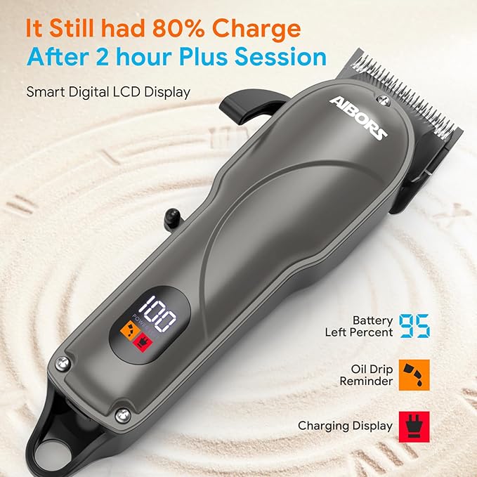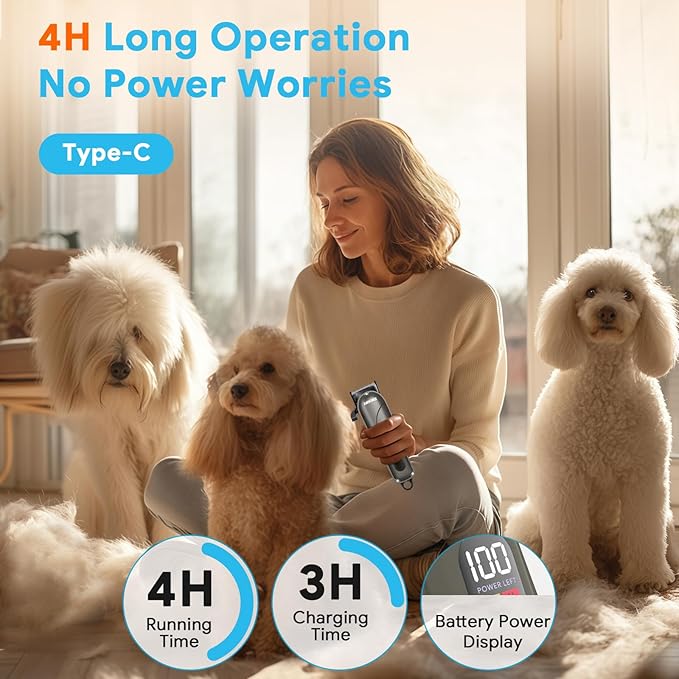 - Long-Lasting Battery with LCD Display: This dog trimmer for grooming offers up to 3-4 hours of runtime on just a 3-hour charge, eliminating the need for replaceable batteries. The built-in LCD display clearly shows the remaining battery life, so you’ll never have to worry about sudden power loss during grooming. Stay in control and enjoy uninterrupted trimming sessions with your pet.