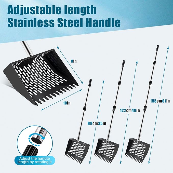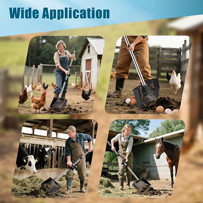 - 【Chicken Poop Scooper Handheld】The sand sifter shovel adjustable function makes it easy to use in various scenarios and for people of different heights. Can be adjustable to 36",49", and 61",you can adjust it to the most suitable length according to your own needs.An ergonomic chicken pooper scooper that adapts to every coop layout