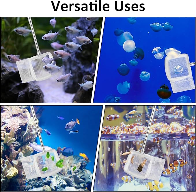 - Durable Telescopic Handle: The stainless steel handle extends from 5.5 inches to 19 inches, allowing you to reach deep into the tank without getting wet. It’s stiff, rust-resistant, and designed for long-lasting use