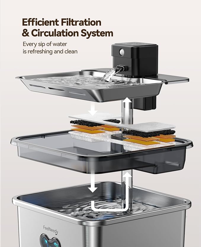 - Upgraded 304 Stainless Steel Material: The pet water fountain is made of upgraded 304 stainless steel. Compared with ordinary materials, they are more sturdy and durable, with significantly improved anti-fall and wear-resistant performance. The stainless steel surface is smooth and easy to clean, and the water tank and tray can be directly put into the dishwasher for cleaning, eliminating tedious cleaning steps, making pets' drinking water healthier and owners' care more worry-free.