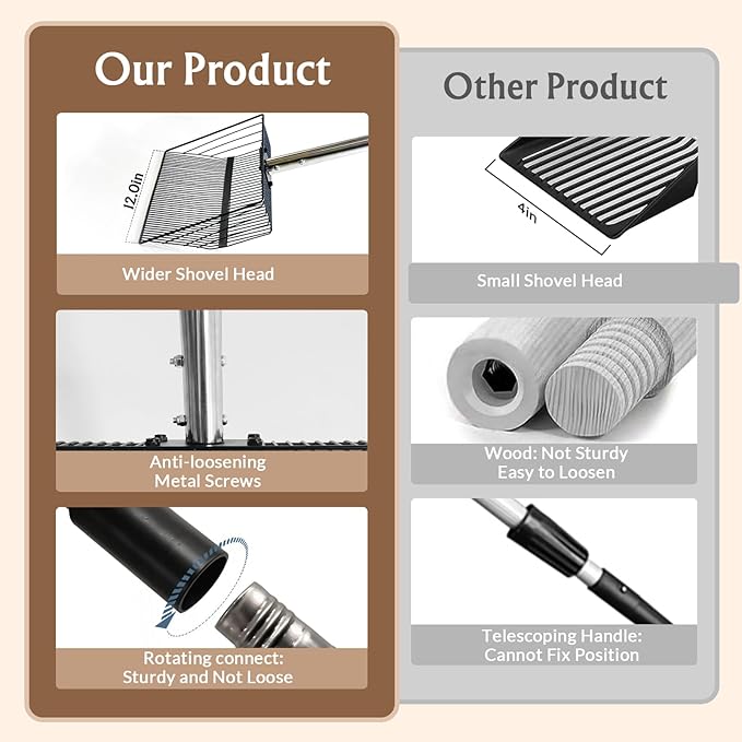 - Versatile Use: Our sifting shovel isn't just for chickens—it's a multi-purpose marvel that excels in a variety of tasks. Whether you're using it to scoop cat litter or clean up after your dog, it can handle it all. It's also perfect as a beach sand sifter, effortlessly separating shells from sand, making it the ultimate tool for any cleaning job.