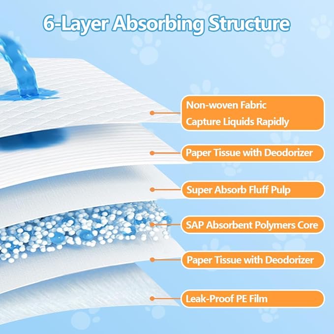 - 6-Layer Leak-Proof Protection: Our friendly dog pee pads with 6-layer thickened design absorb and lock in liquids quickly, preventing leaks to protect floors, furniture, and bedding.