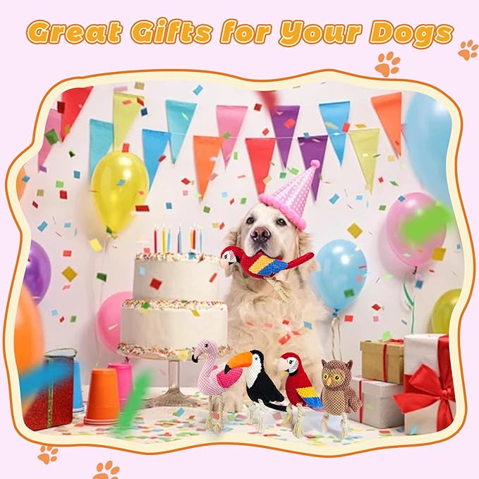 - Squeaky Puppy Toys Pack: Fun 4 pieces of 11.8 inch bird-themed plush toys, dog toys that look like bird, including Flamingo rope chew toy, Parrot toy for dog, Toucan plush, Owl puppy dog toy. These stuffed animal toys are designed as dog chewing toys, ideal for interactive play with squeaky features.
