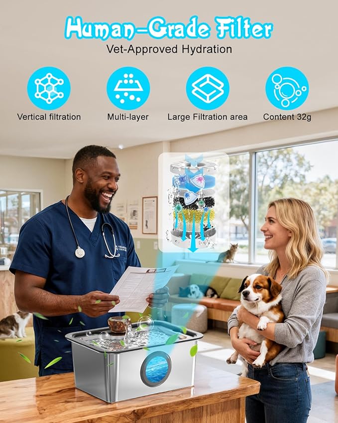 - Human-Grade Filtration System: The IAD big cat and dog water fountain features a food-grade vertical filtration system that effectively removes hair, food residue, dust, odors, and heavy metals, delivering clean, fresh drinking water for your pets. The multi-stage filter combines a sponge pre-filter, activated carbon, and ion exchange resin to significantly improve water quality. With a 35g net weight and oversized filtration surface area, each cartridge achieves optimal purification performance, provide healthier and cleaner water to your pets.