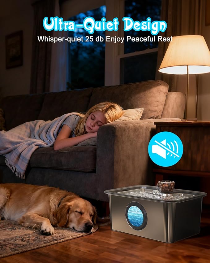 - Ultra-Quiet Pump & Smart Light Reminder: Featuring a whisper-quiet pump operating at just 25dB, this dog water bowl fountain ensures a tranquil environment for both you and your pets to rest undisturbed. Its powerful circulation system delivers a steady flow of fresh water while keeping it optimally oxygenated. With a 2-meter power cord, it's perfect for indoor or outdoor use - place it in the yard to keep your dog hydrated after outdoor play. The built-in smart indicator light changes from white to red when water runs low, serving as a timely reminder for refills.